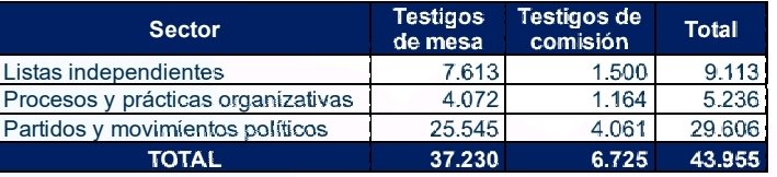 Un total de 43.955 testigos electorales fueron acreditados para participar en las mesas de votación y las comisiones escrutadoras de todo el territorio nacional, con ocasión de las elecciones de los Consejos Municipales y Locales de Juventud del próximo domingo, 19 de octubre. Del total de testigos, 9.113 fueron postulados por listas de jóvenes independientes, lo que equivale al 21 %; 5.236 por procesos y prácticas organizativas formalmente constituidas, correspondiente al 12 %; y 29.606 por partidos y movimientos políticos con personería jurídica vigente, es decir, el 67 %.